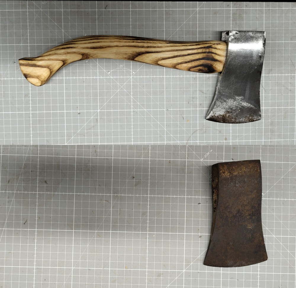 We often receive boxes of items from sheds that are being cleared out, sadly often the contents have not aged well, and may not have been that wonderful even when they were 'mothballed' decades earlier. This unremarkable axe head could have gone for scrap but made a good little project because it was still perfectly functional (it is very difficult to break an axe head). A piece of Ash, from a local tree, was shaped and fitted with new wedges, then lightly scorched with a blowlamp to make it more attractive and functional. The axe is now ready to go and split kindling again for the next 20 years.