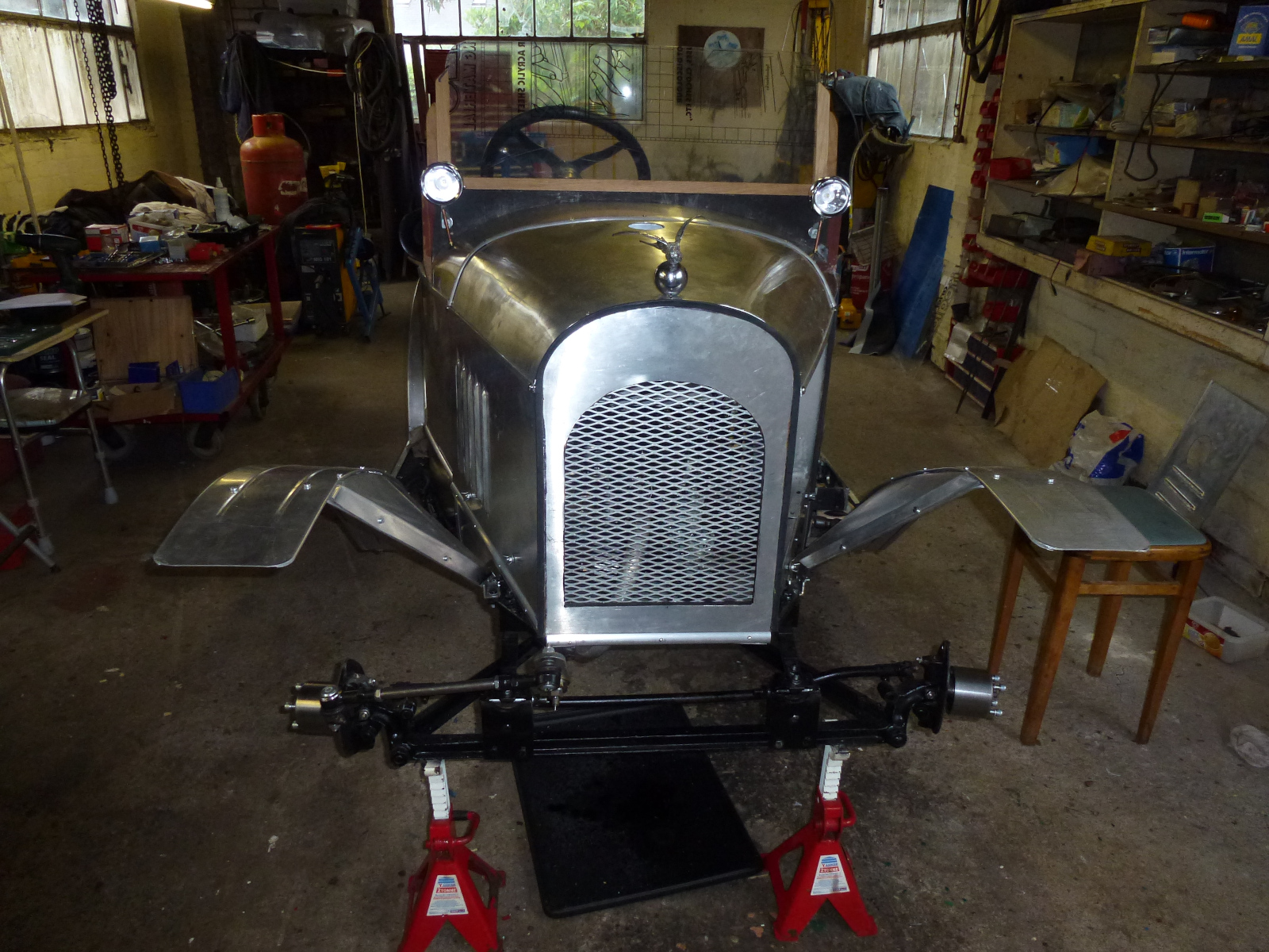 Having the car on axle stands gave easy access to refitting the overhauled engine and permitted coachwork detailing. Leather covered Masonite inner panels and the leather seat base were fitted along with aluminium beading on panel seams, the hardwood windscreen support [with acrylic windscreen pending delivery of the toughened glass screen], the klaxon, and faux acetylene delivery pipes to the headlamps in copper. Once the cockpit top edge trim, the leather seat squab, radiator badge, and door/boot catches are fitted the coachwork will be ready for paint in dark red/black livery.