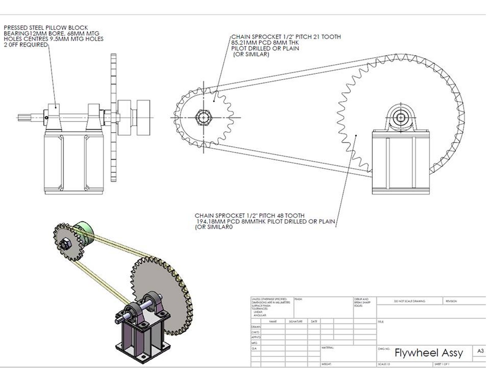 We have sourced a suitable AMAL carburettor, it’s missing a few vital parts but they are being sourced separately prior to a thorough overhaul. The engine cannot be started directly through the flywheel because the nearside front wheel blocks access, so a starting mechanism has been designed and is in fabrication. The starting mechanism will allow a cranked handle start, via a chassis mounted chain wheel, chain, and smaller chain wheel attached to the flywheel by a sprag bearing.