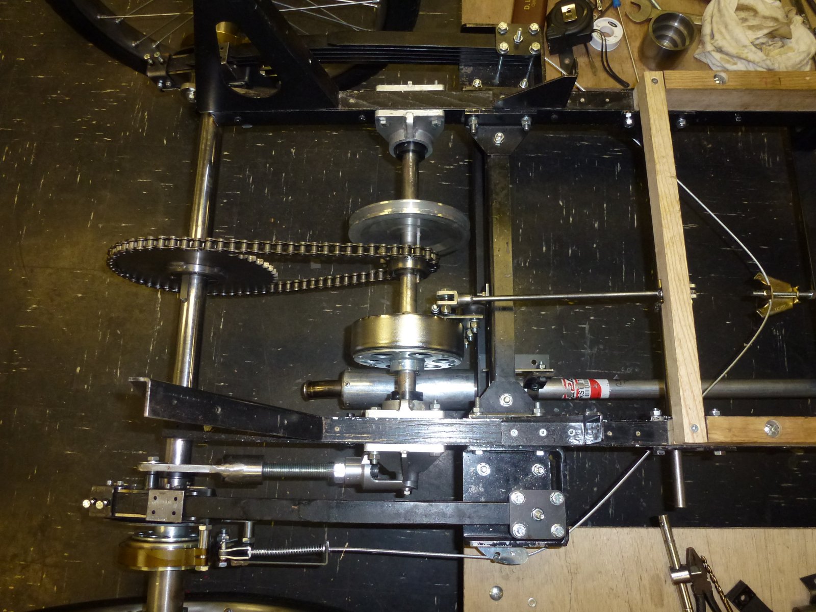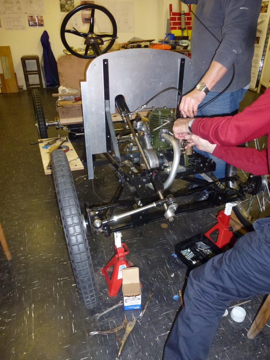 Controls for handbrake, gear change, accelerator, advance/retard and clutch were fitted during the month but a number of problems were revealed. The B&B carb which allowed an engine run back in May was found to stick in the `flat out’ position so it was removed pending us finding a suitable replacement, and there is insufficient space to fit a starting mechanism from a driver side lever to the gearbox, so we are scheming a starting mechanism via the engine flywheel. Choke and engine depressurisation controls are held pending a dashboard to mount the actuators.