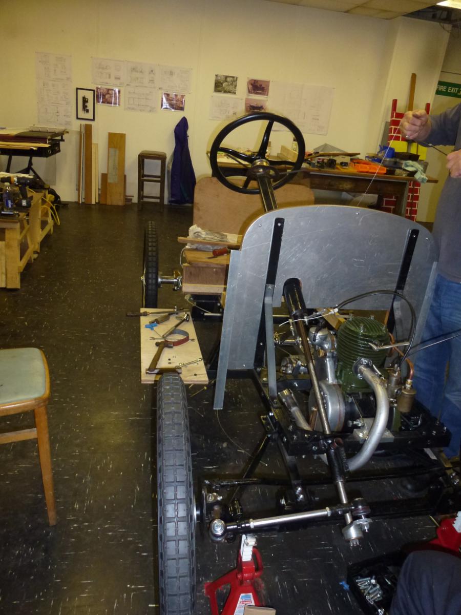At last we are able to steer the car, but the mounted column fouls the petrol tank so the tank is removed for modification; meanwhile we start on engine controls.